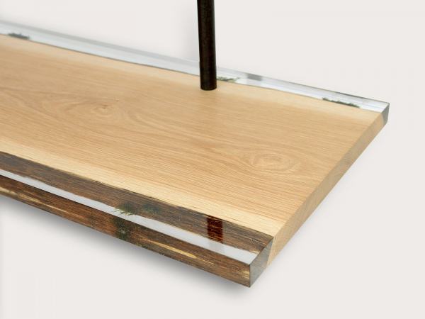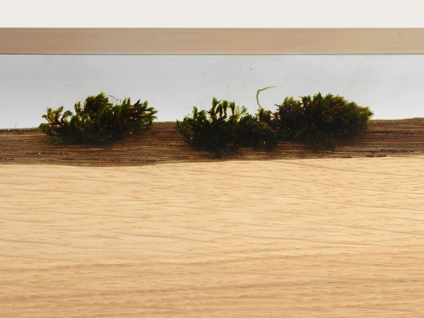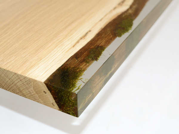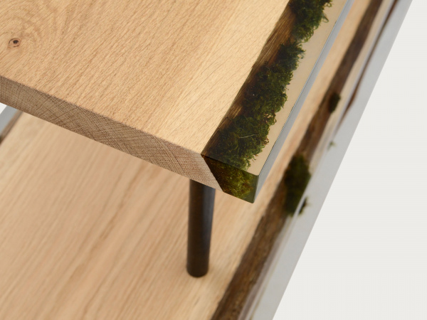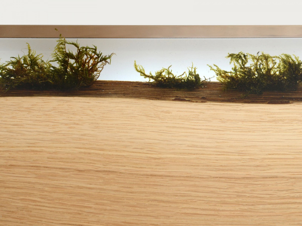 Solid WOOD, Natural MOSSES, Extraclear Polished RESIN, burnished STEEL rods. Natural Wood surface not covered by resin on the section planes. Selective wood coating with matt natural effect.