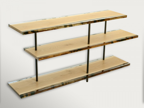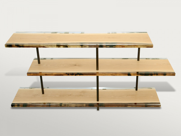 The Woodpile Shelving – made from three mossy planks – is a self-supporting structure looking for utmost essentiality. With its apparently precarious balance, it is a refined dispute between visual instability and actual stability. It is a dizzying challenge to the force of gravity, the expression of a profound aspiration to a transparent, metaphysical lightness, as trees blowing in the breeze.