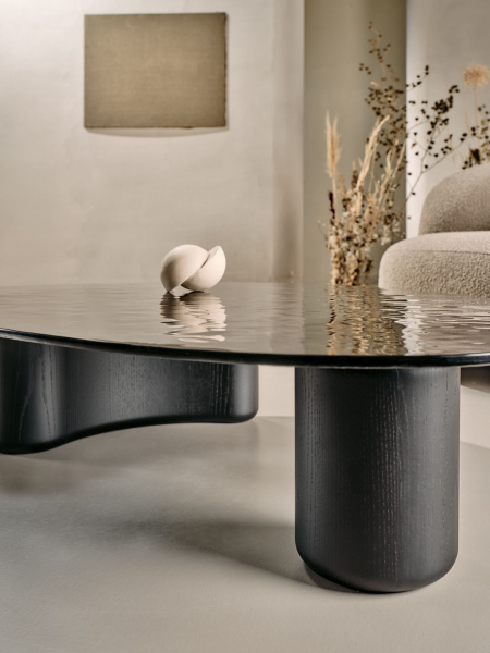 The Lake coffee table masterfully balances organic and geometric shapes, enhanced by the beauty of natural materials. The coffee table takes up space sinuously in the environment, thanks to the wooden base enhanced by refined finishes used for the top, inspired by nature. The result with a strong aesthetic impact does not neglect the functionality of a spacious table top available in glass, ceramic or marble.