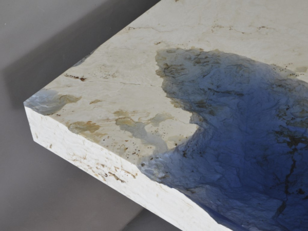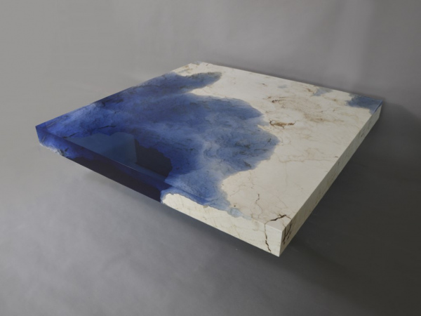 Rapolano's TRAVERTINE, Extraclear Polished RESIN Blue Colour, Metal Legs ( Burnished or RAL Powder Coated ). Natural Travertine surface not covered by resin on the section planes. Selective stone coating with matt natural effect.