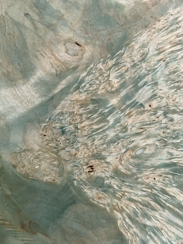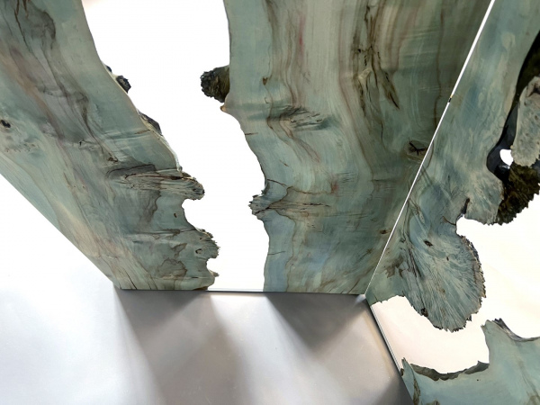 Burled Poplar Wood with Verdigris Impregnation process, Resin, Concealed HINGES in burnished brass, with 180° opening angle. Natural Wood surface not covered by resin on the section planes. Selective wood coating with matt natural effect
