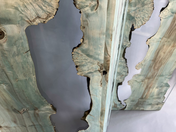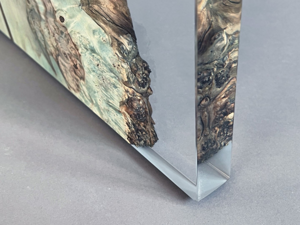 The screen is made of four Burled Maple wood planks with live edges, frozen in a transparent resin like in an infinite moment. The Burled Maple is the wood in which the grain has grown in a deformed manner, but it is absolutely natural, however unusual. The human eye knows it when it sees it in the dashboards of luxury cars, but generally does not know the full external appearance of this rare wood with its amazing live edges.