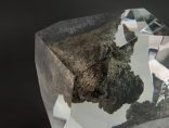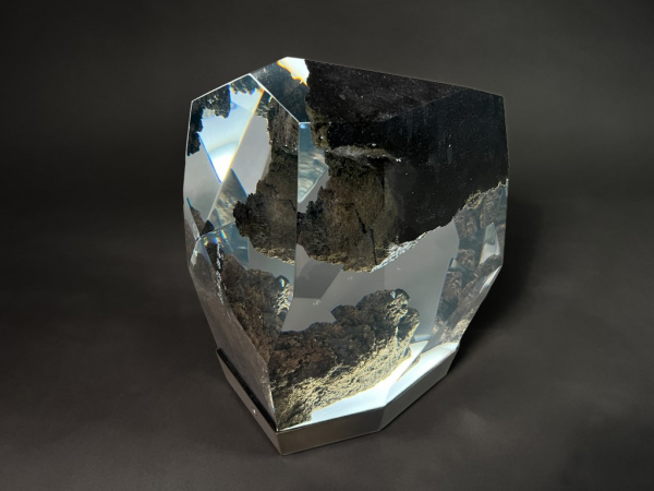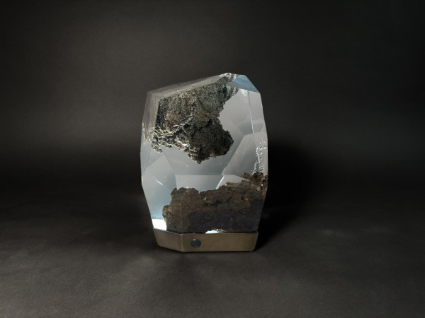 Lava Stone from Etna Volcano, Extraclear Polished Resin, Burnished Steel Base with integrated LED system.