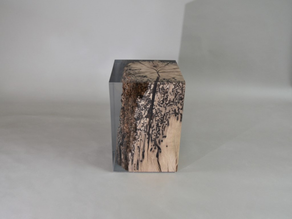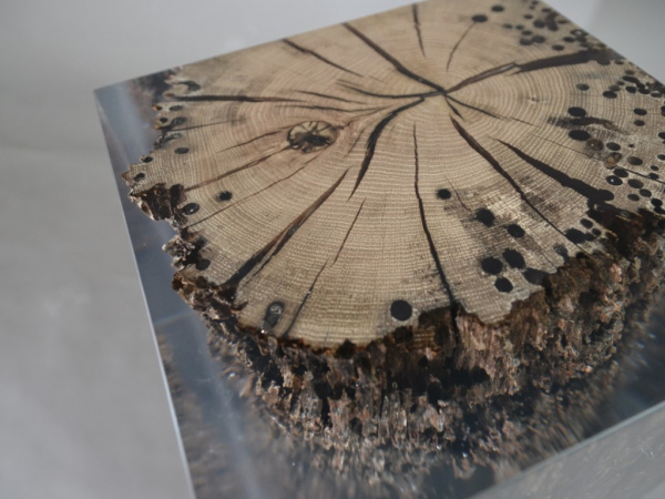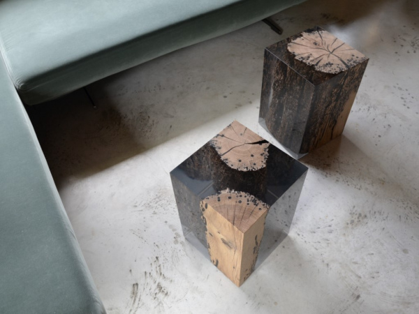 Bricola Solid Oak WOOD, Extraclear Polished RESIN - Colorless or Aquamarine - FELT hidden at the bottom. Natural Wood surface not covered by resin on the section planes. Selective wood coating with matt natural effect.