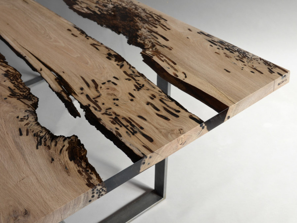 Bricola Solid Oak WOOD, Frosted RESIN - Colorless or Aquamarine - , Burnished STEEL Legs Natural Wood surface not covered by resin on the section planes. Selective wood coating with matt natural effect.