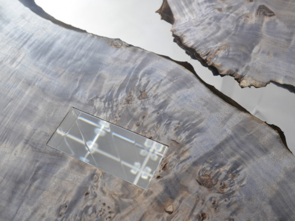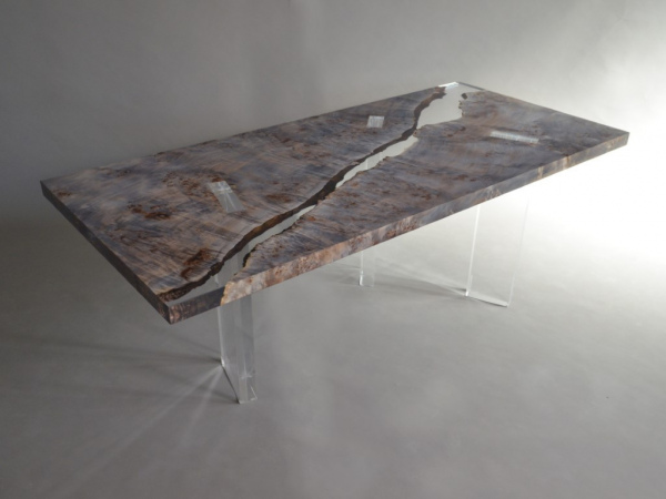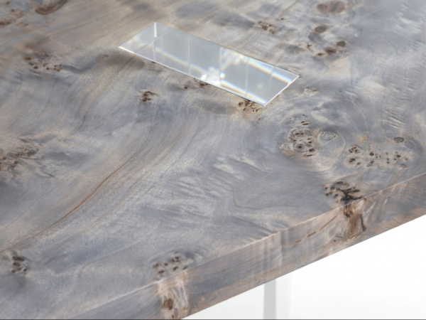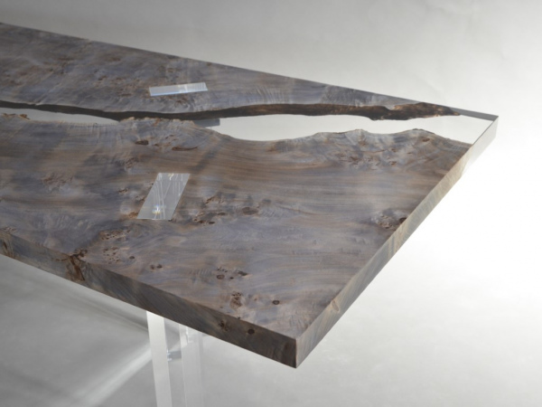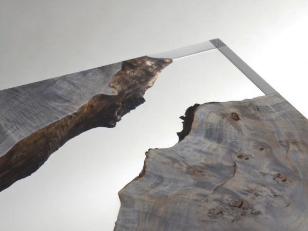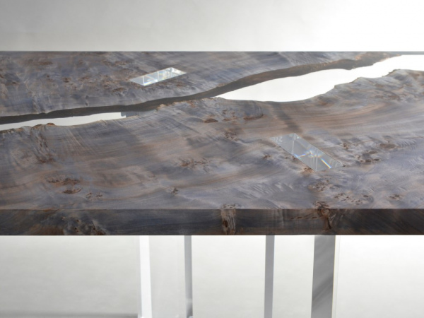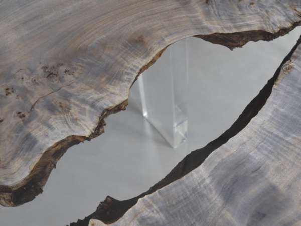 In reality, the tabletop is made of two specular Burled Poplar wood planks with live edges, encased and joined in a transparent resin like Uranus ice, two almost specular organic shapes that extend without touching, supported by four regular transparent pillars that pierce and support them in an apparently inexplicable way.
