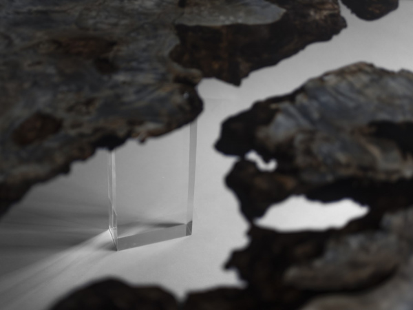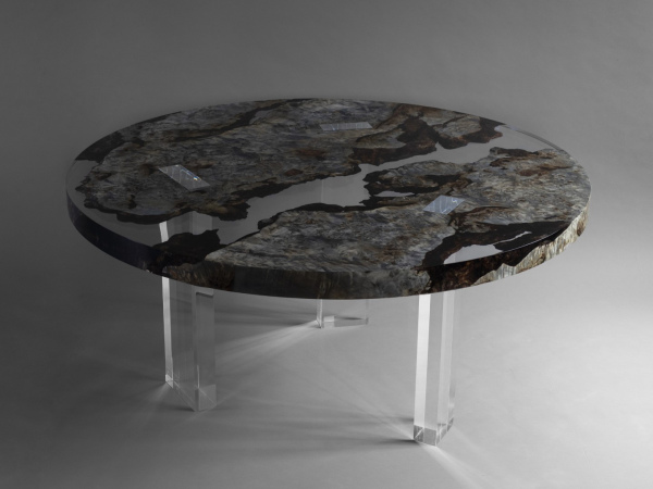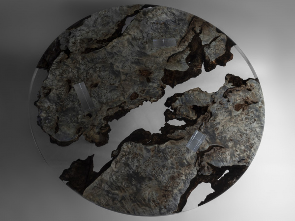 In reality, the tabletop is made of two Burled Poplar wood planks with organic live edges and a completely unusual woodgrain like a planetary atmosphere. They are joined and frozen in a transparent resin like a cosmic ice. Three transparent pillars pierce and support the round top in a seemingly antigravity mode that plays with optical prism effects, hiding the fastening system in what appears to be incomprehensible extraclear pillars full of reflected light. The tabletop seems frozen and suspended in an infinite cosmic moment.