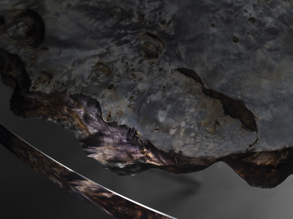 The wood has been thoroughly impregnated with a special colored oil process that brings out these extraordinary holographic grain, making it appear even more extraterrestrial, transcending the ordinary perception.