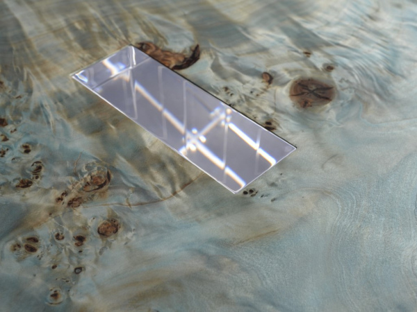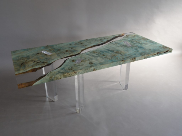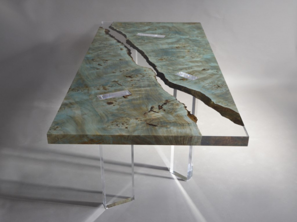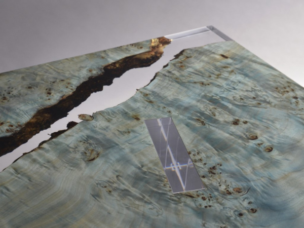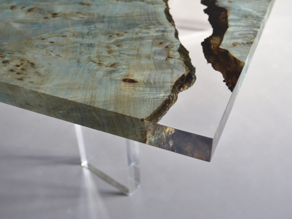 In reality, the tabletop is made of two specular Burled Poplar wood planks with live edges, encased and joined in a transparent resin like Uranus ice, two almost specular organic shapes that extend without touching, supported by four regular transparent pillars that pierce and support them in an apparently inexplicable way.