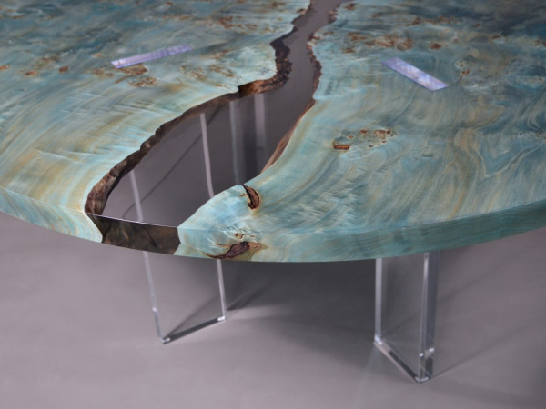 In reality, the tabletop is made of two specular Burled Poplar wood planks with live edges, encased and joined in a transparent resin like Uranus ice, two almost specular organic shapes that extend without touching, supported by four regular transparent pillars that pierce and support them in an apparently inexplicable way.