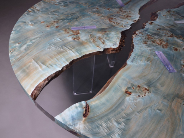 The wood has been thoroughly impregnated with a special verdigris and oil liquid process that brings out these extraordinary holographic grain, making it appear even more extraterrestrial. So, it is not a Uranus table, it is a terrestrial table which also represents the earthly Eden in which we can still live. An impulse to study and learn about our planet, transcending the ordinary perception.