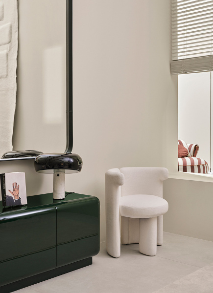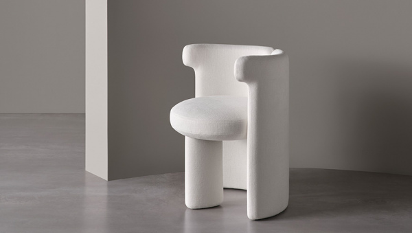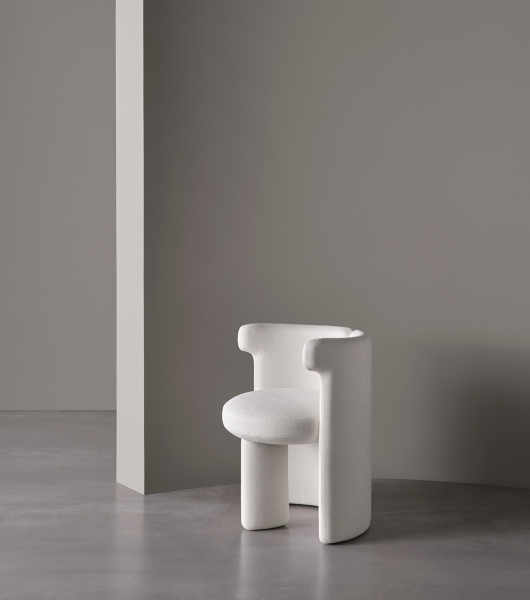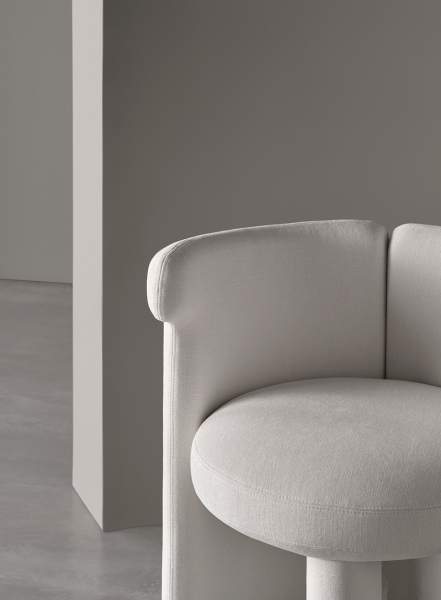 Conceived as both a dining chair and an armchair, Claudine is a seat that can be used as complementary furniture to Cosette chairs or as an independent product. Claudine has a compact back and a monolithic look, with a single, large front leg that may be upholstered in fabric, wood, or lacquer, giving the piece a personal touch and an intense, refined visual appeal.