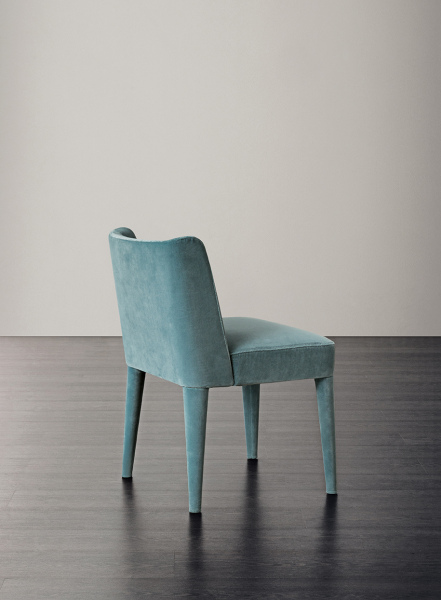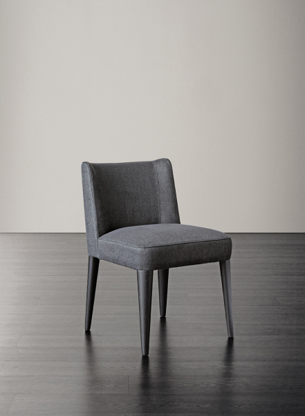 A slightly curved back and a wide seat are the main features of this elegant and comfortable chair, marked by elegant proportions and soft shapes. The stained oak legs may also be covered with the same fabric of the seat for a 'total look' effect.