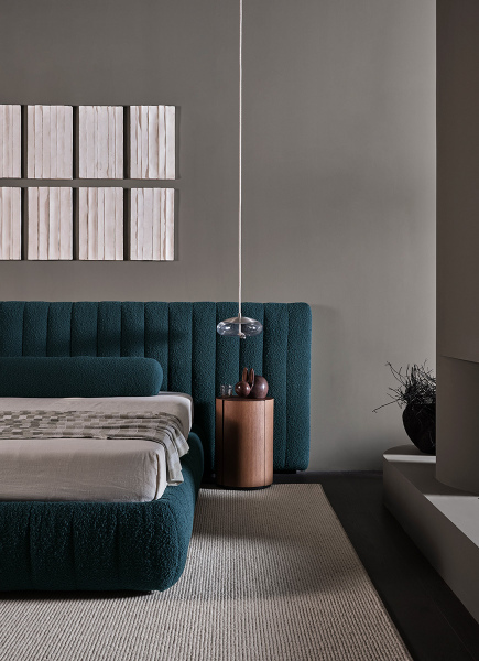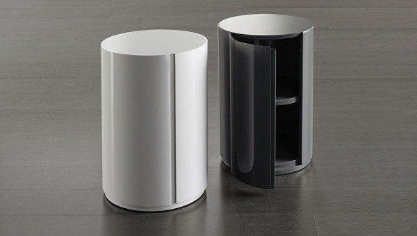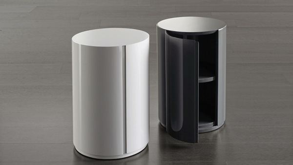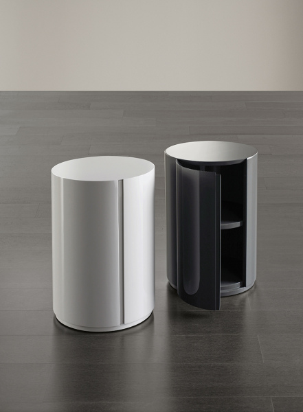 Collection of bedside tables with cylindrical shape, with two storage spaces and a shelf; either in wood or with matt or glossy lacquer finishes, in the interiors they are perfect to match with the Gong low tables.