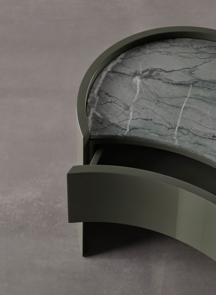 Essential and functional shapes: Johnny is the new Meridiani complement for the bedroom. Johnny is a cylindrical night table available with drawers or with a door, defined by a concave front design and a lowered top, which can be made in glossy or matt lacquer - like the frame - as well as in marble. To complete the collection, a saddle leather cover can be placed over the existing top.