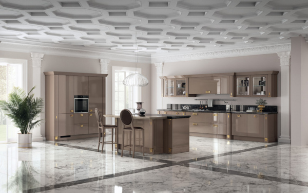 The valuable materials used are one of the distinguishing features of this kitchen: the marriage between the Mink glossy lacquered finish and the Ebony colour leather - a material that is available for the cabinets - lends the entire composition a superior and prestigious appeal.